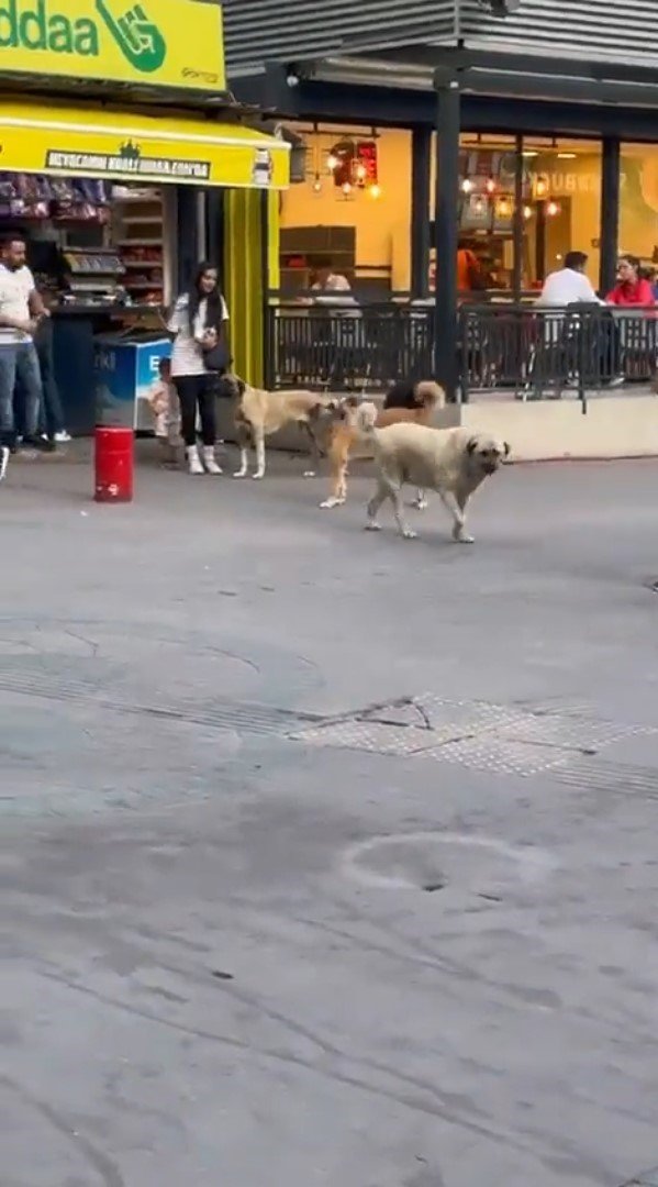 Ankara'da başıboş sokak köpekleri, küçük çocuğu olan bir kadının etrafını çevirdi. O anlar bir vatandaşın cep telefonu kamerasına yansıdı.