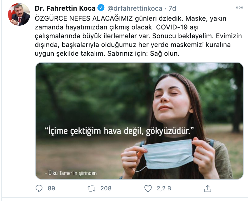 Sağlık Bakanı Fahrettin Koca sosyal medyadaki paylaşımında, "Maske, yakın zamanda hayatımızdan çıkmış olacak." müjdesini verdi.